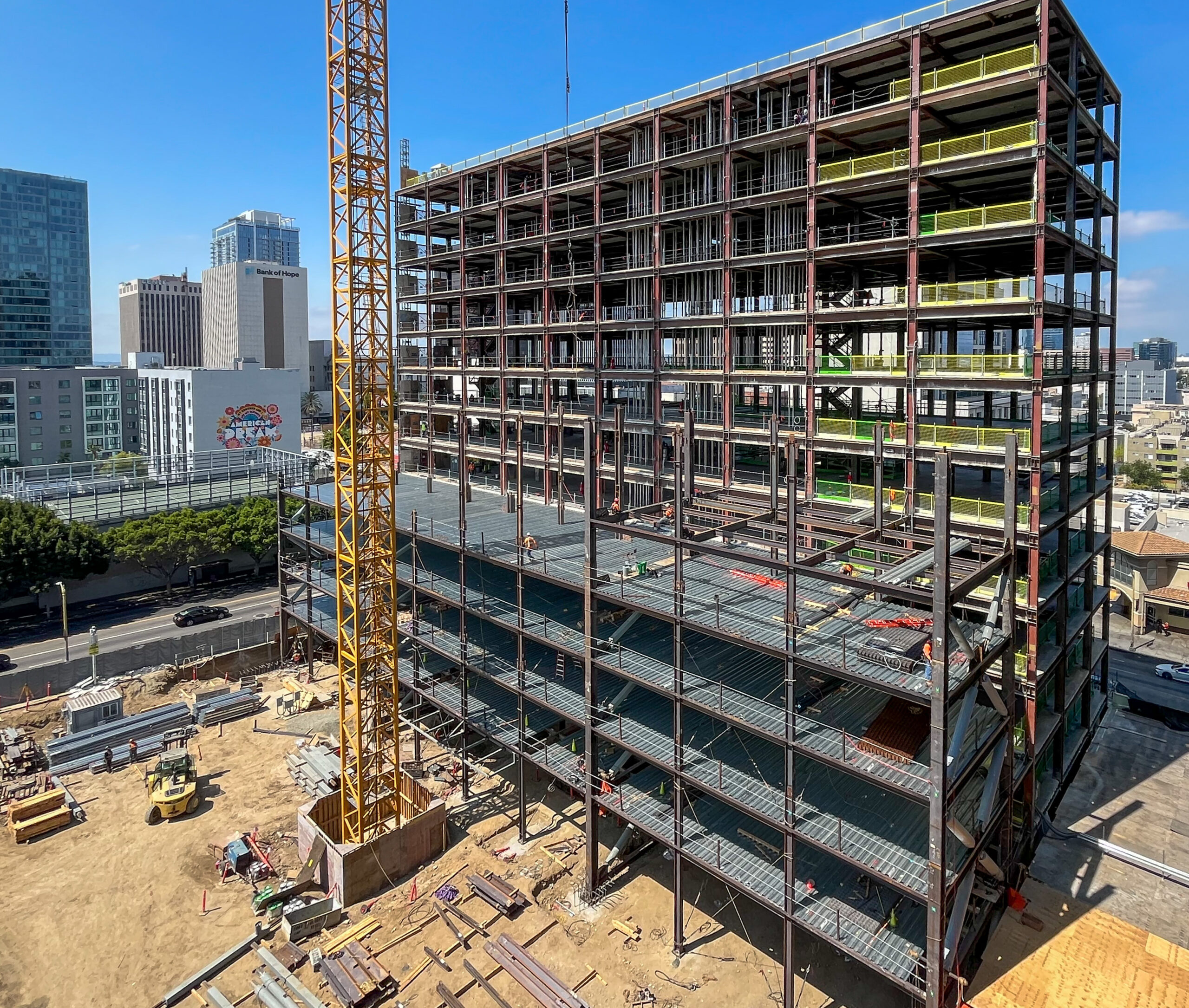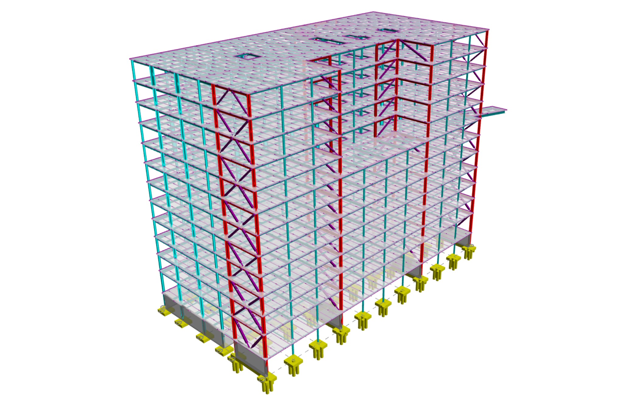 The structural design addresses seismic vulnerabilities of the original 1966 structure by using the new structure to buttress and strengthen the existing building through the strategic placement of new steel buckling-restrained braced frames (BRBF). The new addition’s gravity system incorporates composite steel beams supporting lightweight concrete over a metal deck, while the existing structure’s steel-framed systems are retained. The foundation system integrates existing belled caissons with new auger-cast piles. A key aspect of this project is its commitment to sustainable redevelopment. By revitalizing an existing underutilized urban asset, the project significantly reduces embodied carbon and utilizes innovative materials like Expanded Shale, Clay, and Slate (ESCS) lightweight aggregate.