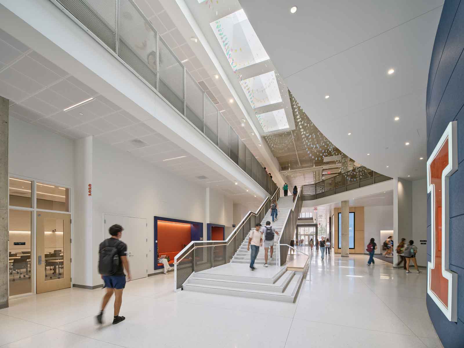 Wymer Hall includes a 200-seat auditorium, two 80-seat classrooms, and four 60-seat classrooms. In support of the College’s rapidly growing online programs, the new building features two 40’x40’ sound stages, five blackbox studios, and six control booths. 18 additional meeting and collaborative rooms provide expanded space for experiential learning, group work, and meetings with recruiters. Additionally, 84 new office spaces will support the College’s growing faculty and staff.